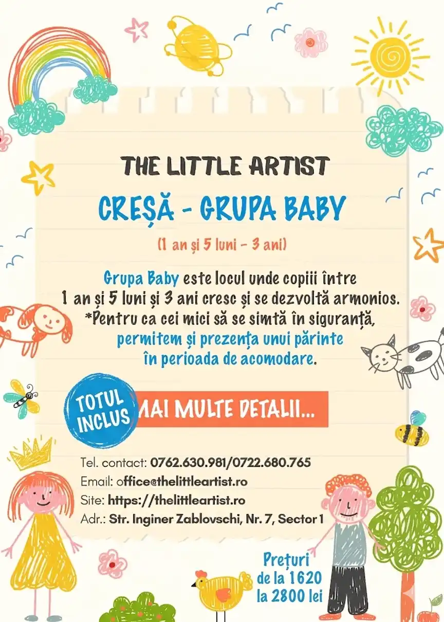 Începând de la Grupa Baby (1 an și 5 luni – 3 ani). La The Little Artist îi primim cu drag pe cei mai mici dintre micii exploratori. Grupa Baby este locul unde copiii între 1 an și 5 luni și 3 ani cresc și se dezvoltă armonios. *Pentru ca cei mici să se simtă în siguranță, permitem și prezența unui părinte în perioada de acomodare.